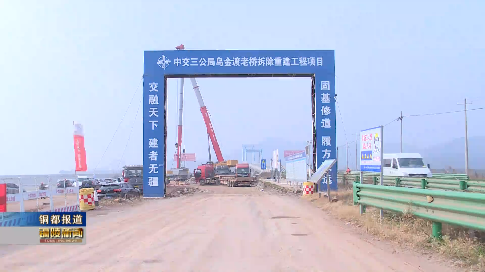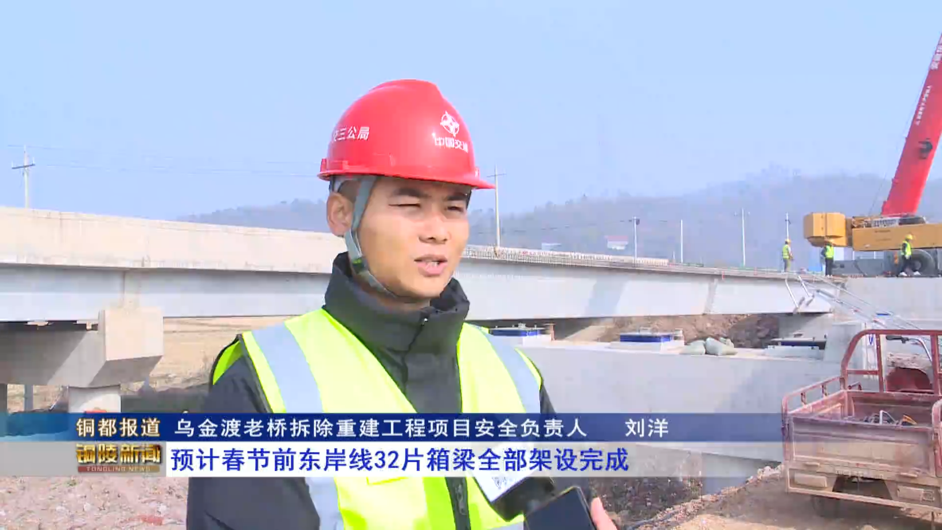 乌金渡老桥拆除重建工程项目安全负责人 刘洋:首片箱梁架设成功意味着马上就转战到桥面系施工,预计春节前东岸线32片箱梁全部架设完成,预计2025年项目通车。