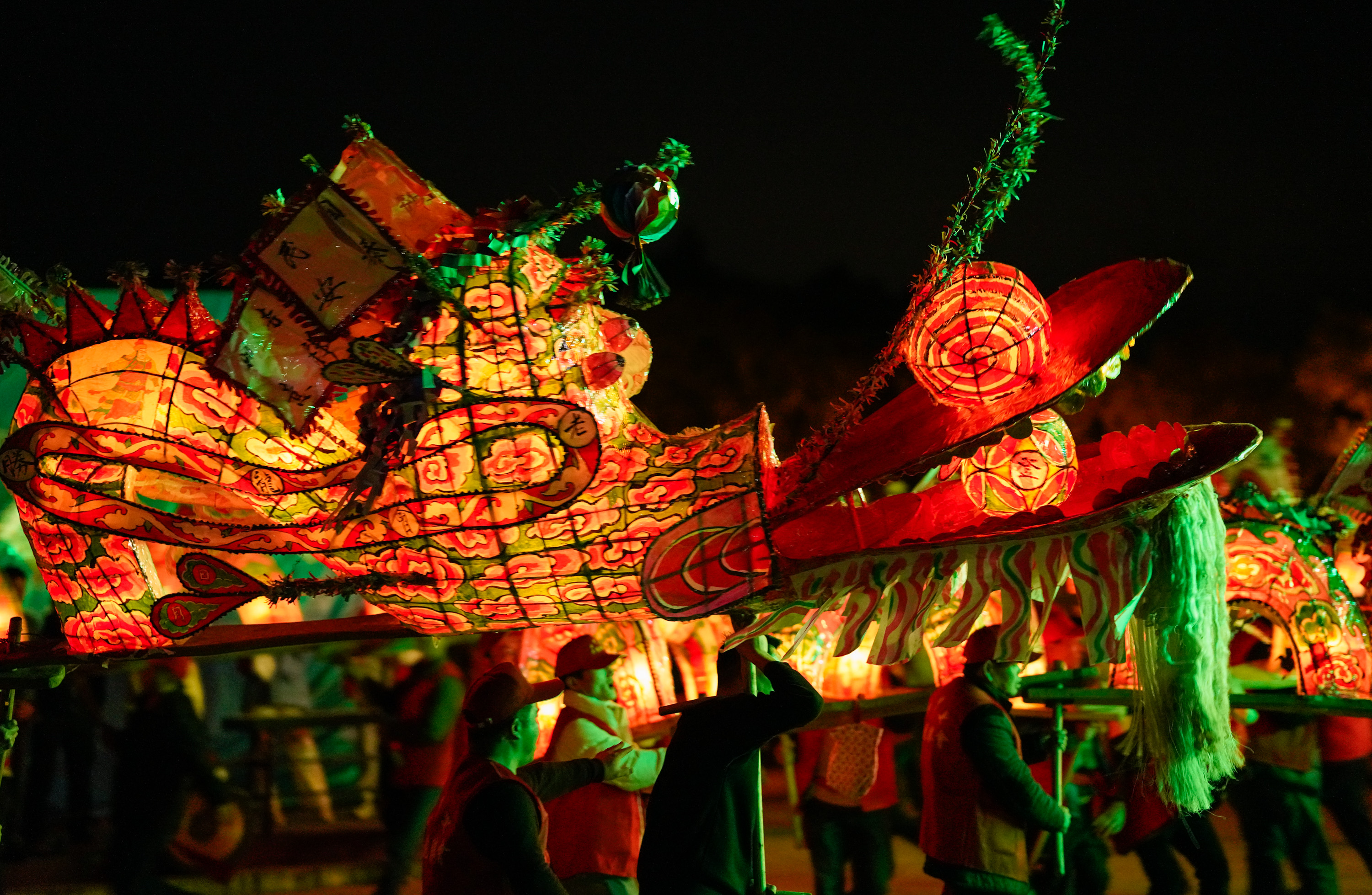 60多位舞者们巧妙操控,前面引灯开路,后面板龙狂舞,龙啸天、龙翻身等动作行云流水,使板龙仿佛活了过来。