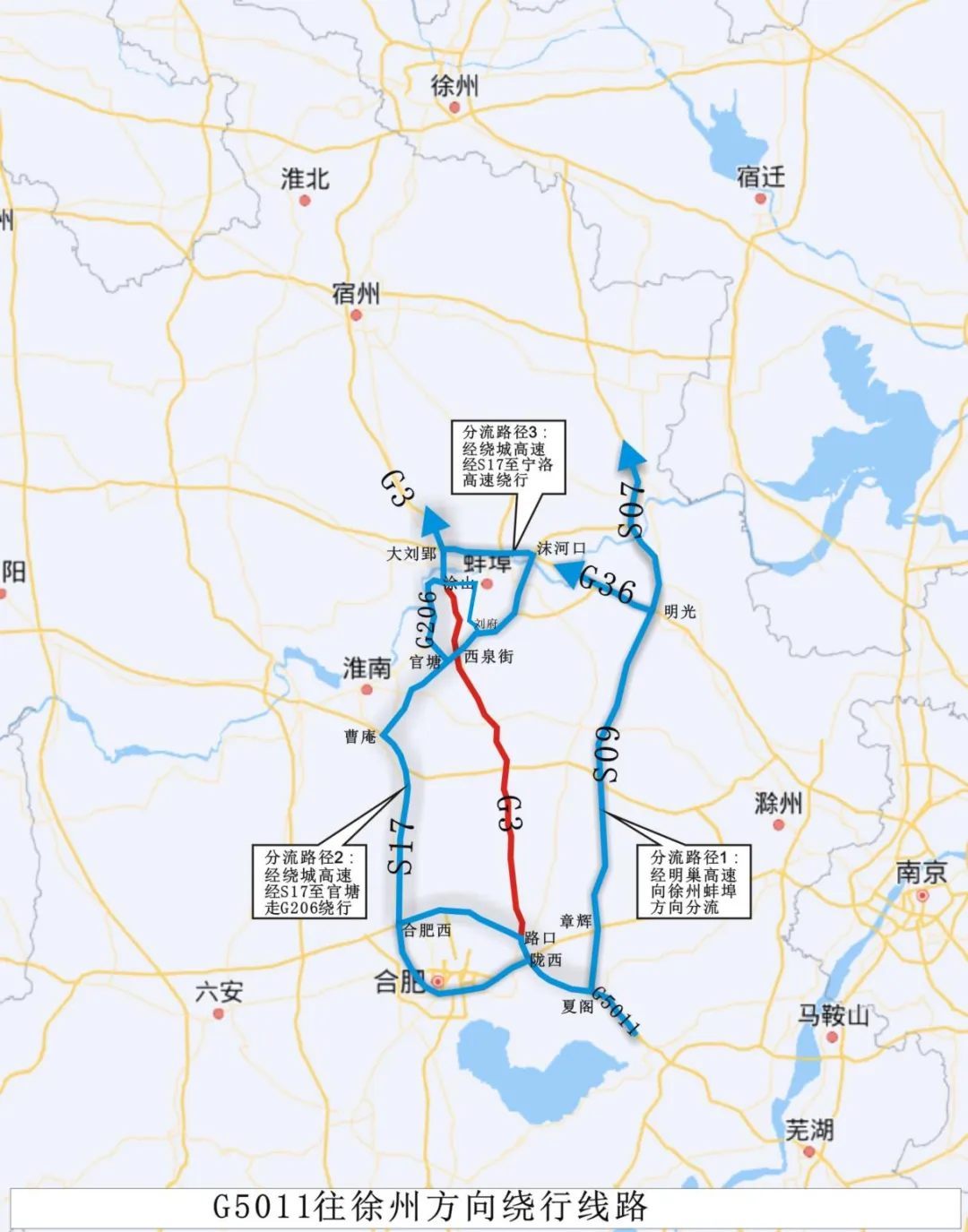 合肥市及周边往蚌埠、徐州方向选择S17蚌合高速绕行,也可由凤阳连接线绕行。