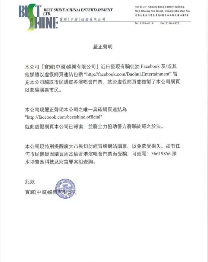 声明表示,这几天有骗子用复制了该公司信息的虚假网页冒充公司,骗市民购买各演唱会的门票,就此公司已报案,并将全力协助警方将骗子绳之于法。