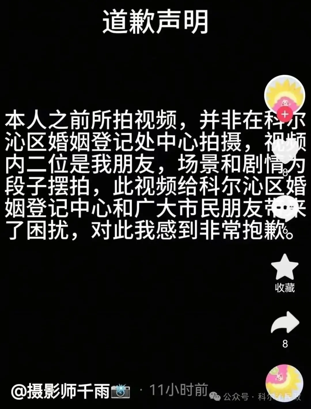 近日,一条背景有“通辽市科尔沁区婚姻登记处”字样的视频在抖音平台上发布和传播,我们通过抖音平台联系了当事人。
