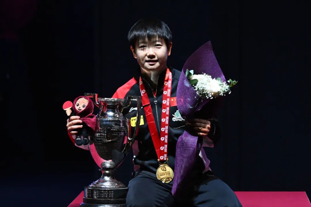5月25日,冠军中国选手孙颖莎在颁奖仪式上。当日,在卡塔尔多哈举行的2025世界乒乓球锦标赛女子单打决赛中,中国选手孙颖莎4比3战胜中国选手王曼昱,夺得冠军。新华社记者 贺长山 摄