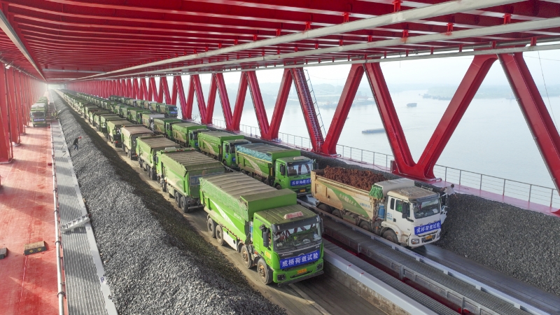 在静载试验中,134辆载重38吨的货车停靠在上层公路桥面预定位置,80辆载重50吨的货车停靠在下层铁路桥面预定位置,通过分批次加载(即“分级加载”)的方式,逐步达到约9000吨的总荷载。工程师同步测试桥梁各关键部位的相关数据。