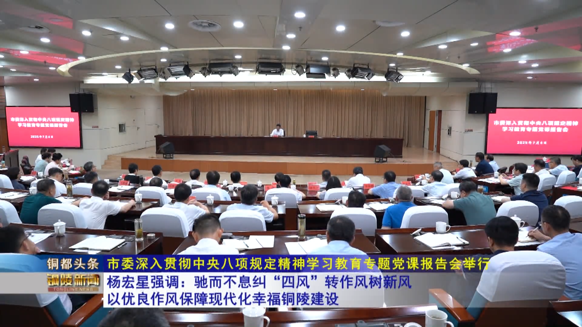 7月4号上午,市委举行深入贯彻中央八项规定精神学习教育专题党课报告会。市委书记杨宏星作党课报告,强调要深入学习习近平总书记关于加强党的作风建设的重要论述和考察安徽重要讲话精神,认真学习习近平总书记在中央政治局第二十一次集体学习时的重要讲话精神,锲而不舍落实中央八项规定精神,驰而不息纠“四风”、转作风、树新风,真抓实干、创先争优,以优良作风促进和保障现代化幸福铜陵建设。市委副书记、市长孔涛主持。市领导张梦生、昌红梅、郑刚、胡启书、杨文萍、马军、史学田等出席。